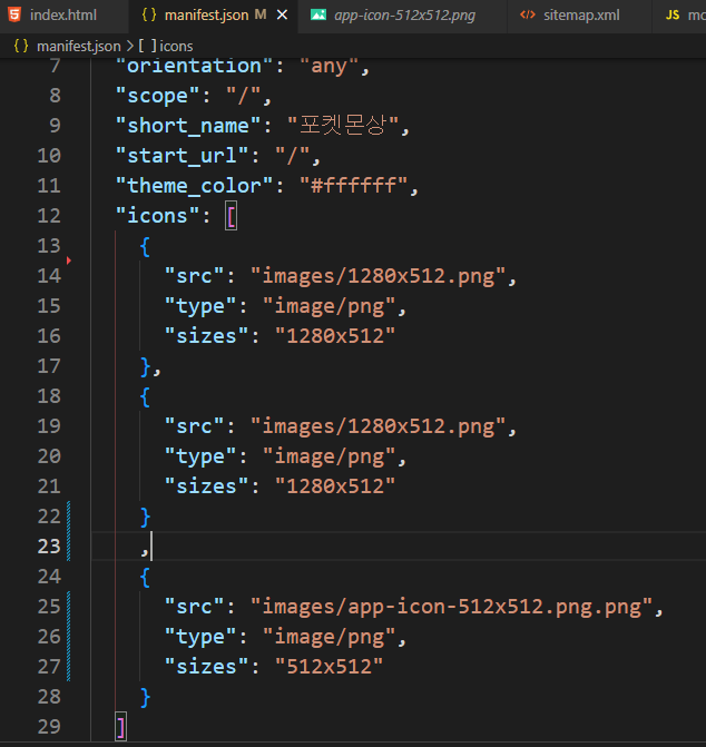 index.html 파일에 방금 생성한 manifest.json 파일을 link 코드를 추가하고 필자의 경우 netlify와 github에 연동되어 있어서 업로드하고 웹 사이트를 재 배포하였습니다.