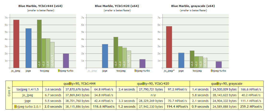 A JPEG encoder in a single C++ file ... posted December 27, 2018 by Stephan Brumme, updated June 17, 2019 Recently, one of my programs needed to write a few JPEG files. The obvious choice is to link against libjpeg (or even better: libjpeg-turbo). These li
