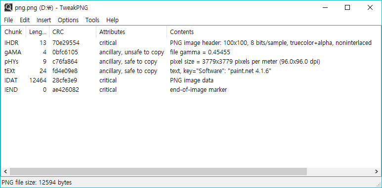 위 그림은 PNG 이미지를 TweakPNG 로 오픈했을 때의 해당 포맷을 분석한 결과이다.