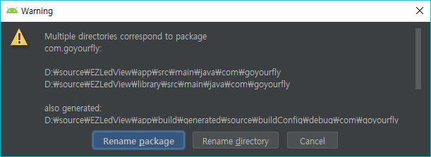 아래와 같은 Warning 문구가 나타나는데 Rename package 버튼을 클릭합니다.