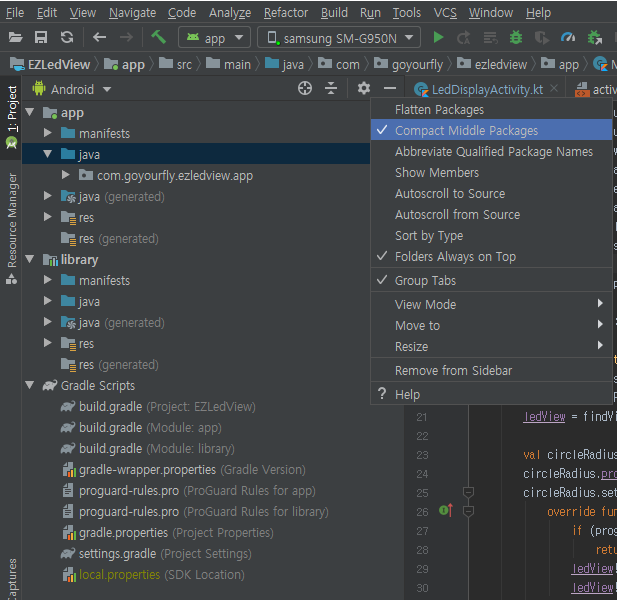 왼쪽 상단 Android Navigator 메뉴의 톱니바퀴 모양 설정을 클릭합니다. 체크되어 있는 Compact Middle Packages를 클릭해서 해제합니다.