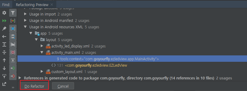 하단 창에 변경되는 내역을 표시해줍니다. Do Refactor 버튼을 눌러 패키지 명을 변경합니다.