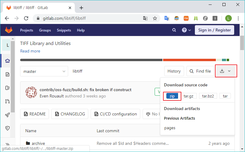 설치가 완료되면 libtiff 소스를 https://gitlab.com/libtiff/libtiff 접속하여 다운로드한다.