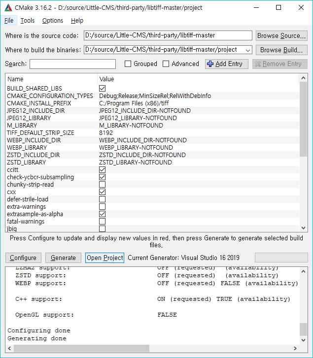 Generate 선택하면 visual studio 설루션을 생성해준다. OpenProject를 클릭하면 Visual Studio에서 실행되는데 LIBTIFF에서 사용하는 Util, Contrib Project 도 모두 생성한다. LCMS2에서 사용하는 것은 tiff 프로젝트 임으로 tiff 프로젝트 외에 나머지는 모두 제거한다.