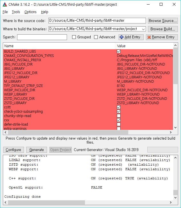 Configure 가 끝나면 아래와 같이 Generate 버튼이 활성이 되며 feature 설정을 할 수 있다. LIBTIFF의 경우 ZSTD, WEBP, JBIG, JPEG 등 순수 TIFF 이미지가 아닌 다른 이미지 포맷도 압축 형식으로 지원이 가능하기 때문에 순수 TIFF 외에 모두 Entry에서 제거한다.