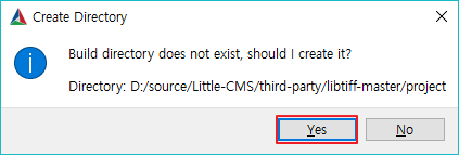 build the binaries: 폴더에 입력한 project 경로에 폴더가 없어서 아래의 warning 나온다. Yes 버튼을 눌러 폴더를 생성한다.
