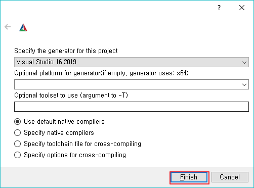 project 환경 설정을 위해서 Visual Studio 16 2019를 선택한다. (현재 컴퓨터에 설치되어 있는 visual studio 버전을 선택)