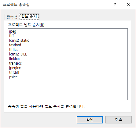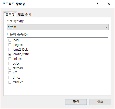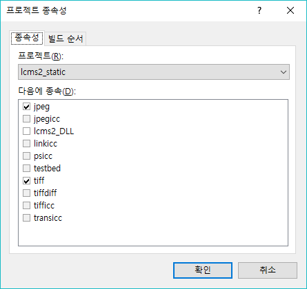 [프로젝트 종속성] - [종속성]에서 LCMS2_STATIC을 선택하고 JPEG, TIFF 2가지 프로젝트를 종속 설정한다.