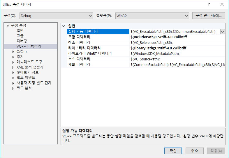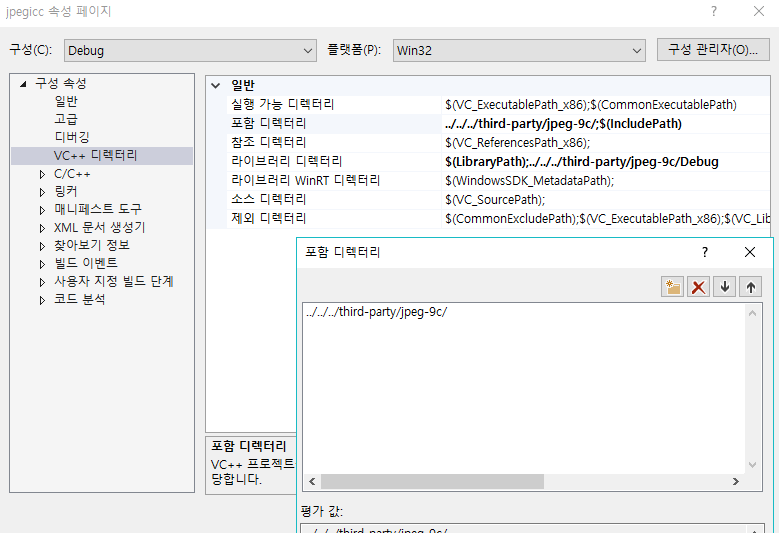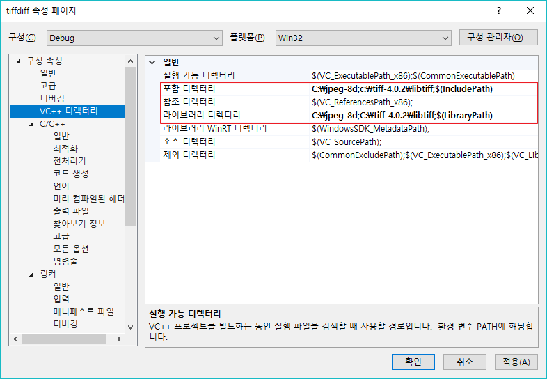 LCMS2 라이브러리는 기본적으로 절대 경로로 선언되어 있다. LIBJPEG, LIBTIFF를 추가하였으니 상대 경로로 변경해야 한다. 변경해야 하는 프로젝트는 jpegicc, tifficc, tiffdiff 3 가지 프로젝트에 경로를 변경해야 한다.