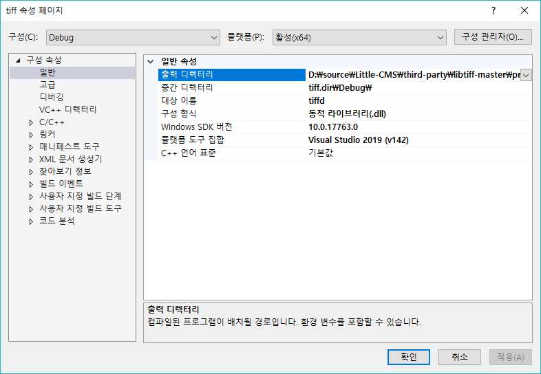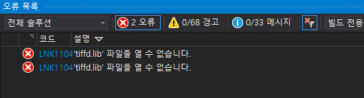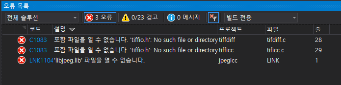 이전 글에서 LCMS2 프로젝트를 Visual Studio 2019에서 사용을 하기 위한 기본적인 환경설정을 하였다. LIBJPEG, LIBTIFF 정적 라이브러리와 포함 폴더를 환경 설정을 포스팅하겠다. LCMS2.sln 설루션을 빌드하면은 아래와 같이 포함 디렉터리에 헤더 파일과 링커 경로에 정적 라이브러리가 없어서 오류가 발생한다.