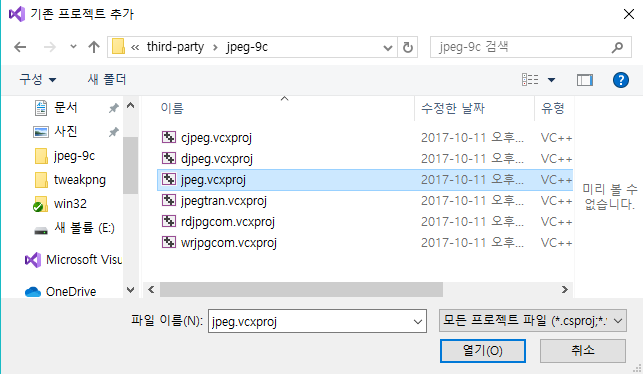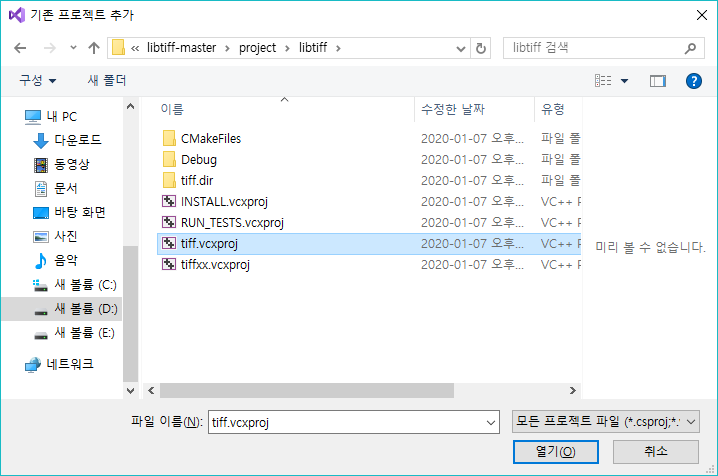 추가 - 기존 프로젝트 추가 탭을 눌러서 jpeg.vcxproj, tiff.vcxproj를 추가한다.