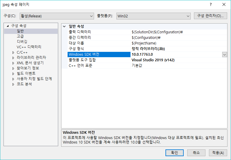 jpeg, tiff 프로젝트에서 구성 형식과 Window SDK 버전을 현재 컴퓨터에 설치되어 있는 버전으로 변경한다.