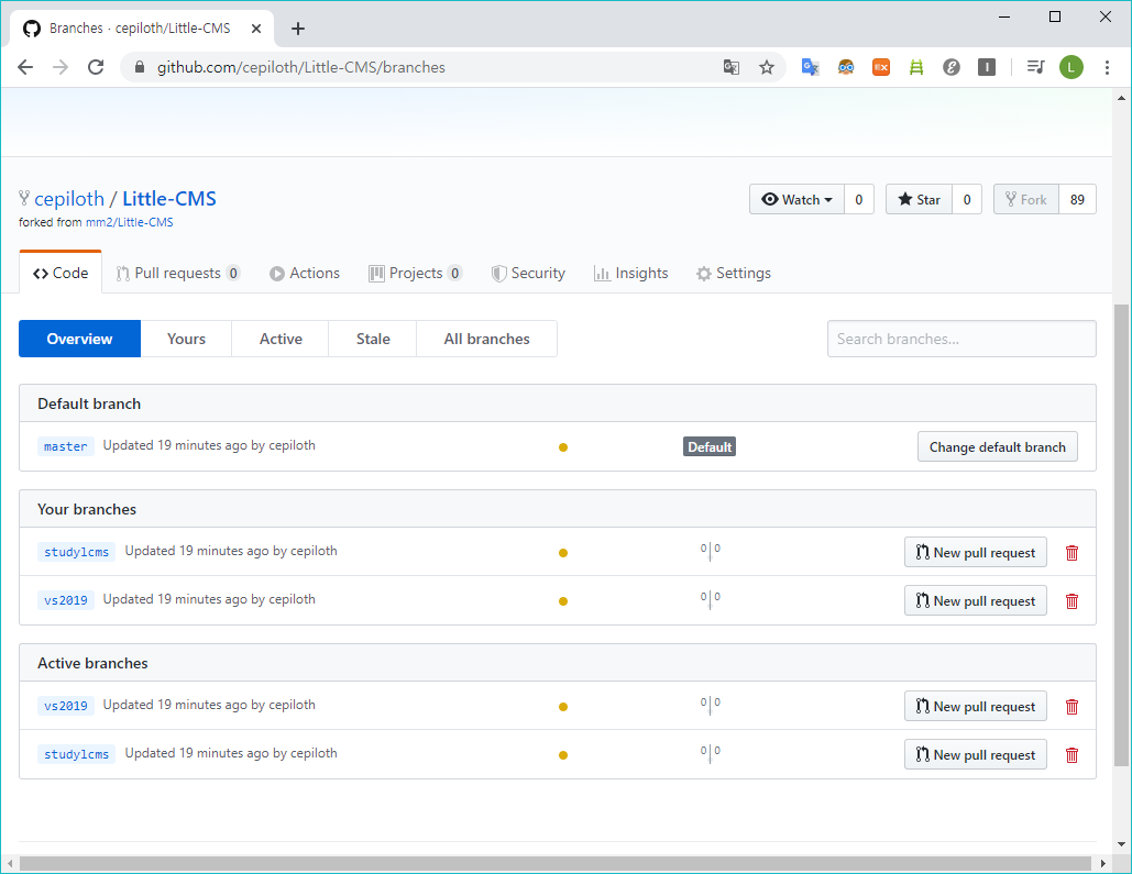 이후에 웹사이트로 이동하여 방금 생성하고 commit 한 vs2019 branch에 New pull reqeust 버튼을 클릭한다.