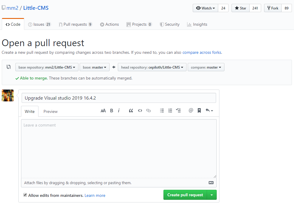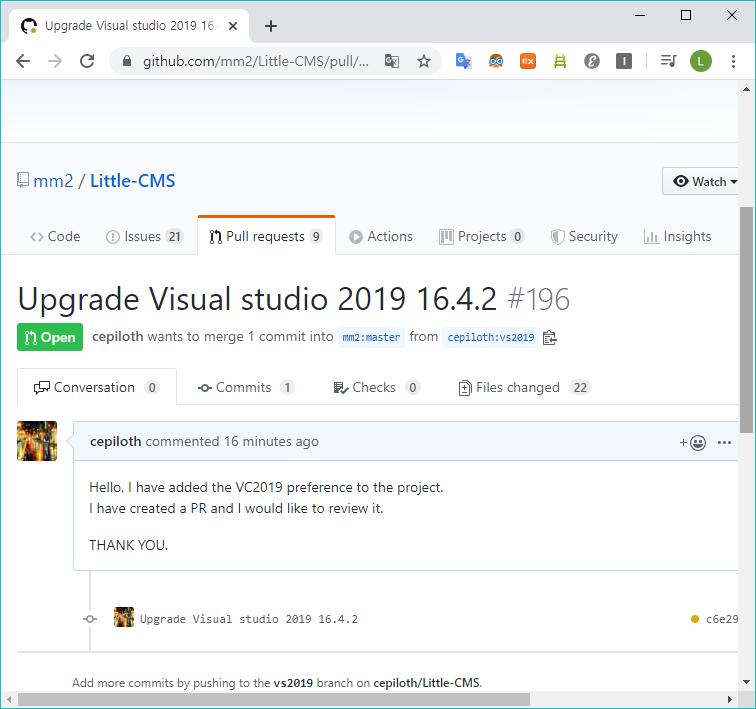 LCMS2 라이브러리를 공부하려는 찰나에 어쩌다 보니? PR까지 하게 되었다. 일단은 해당 프로젝트에 VC2019 환경 구성이 없어서 글을 포스팅하면서 정리하다가 master branch에 VC2019 환경이 없으니 PR을 보내면 나도 오픈소스 contributor 가 될 수 있지 않을까 하는 암코양이 같은 생각으로 PR 보내 보았다.