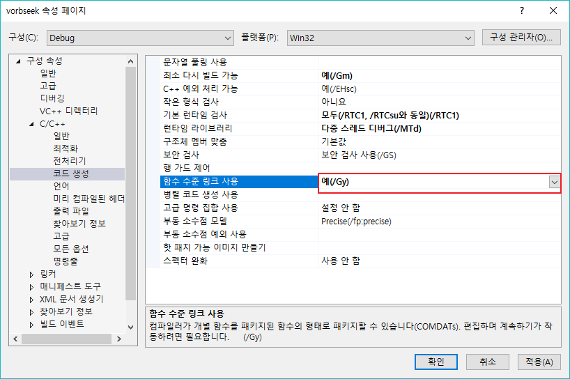 프로젝트 구성 속성 - C/C++ / 코드 생성 - 함수 수준 링크 사용을 아래와 같이 변경한다.