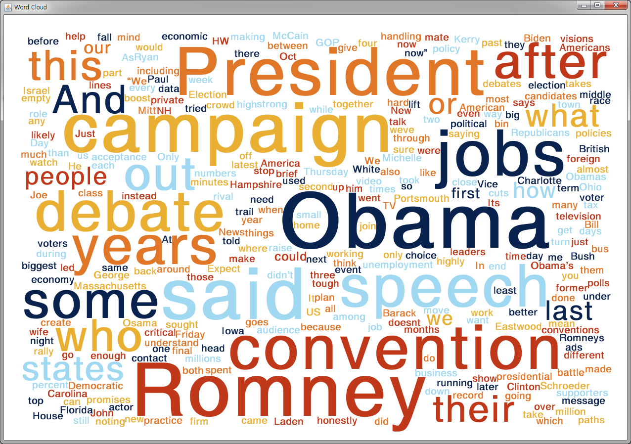 StringProcessor class 에서는 file에서 읽은 문장을 단어 형태로 가공하는 역할과 빈도(weight)를 구하여 WordCount 가중치가 있는 단어 배열을 만든다. 이후 CloudImageGenerate class에서는 가중치가 있는 단어 배열을 이용하여 문자의 외곽라인 영역을 구하여 다른 글자와 그리는 영역을 겹치지 않게 비트맵에 그리는 역할을 한다.