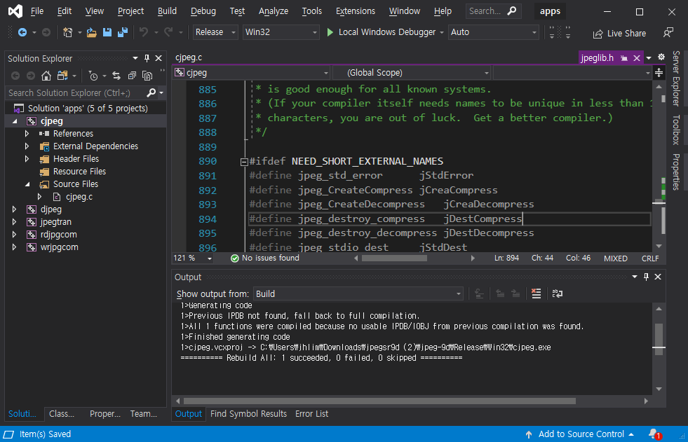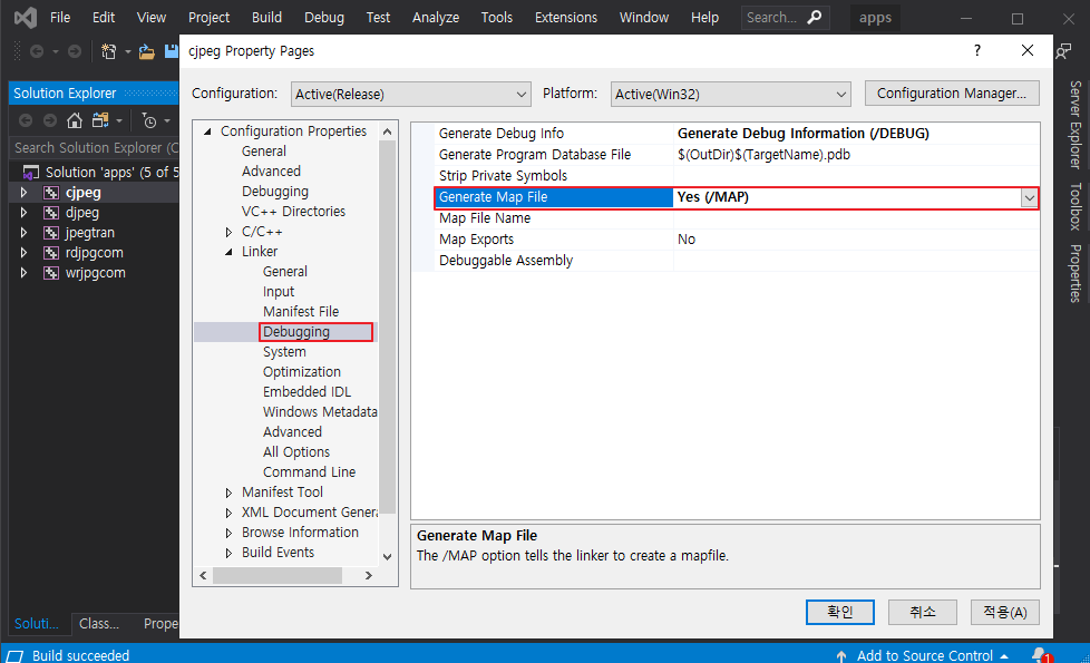 libjpeg.sln 솔루션은 정적라이브러리 프로젝트라서 Linker 탭이 없다. 같은 경로에 있는 app.sln 솔루션을 열어 아래와같이 Linker - Debugging - Generate Map File 에 설정을 Yes (/MAP)로 한다.