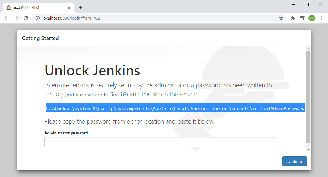 설치가 완료되면 Unlock Jenkins 화면이 나오면서 비밀번호를 입력하는 창이 나옵니다. 각자 컴퓨터 환경에 따라 다르겠지만 initalAdminPassword 경로로 가면 비밀번호를 확인할 수 있습니다.