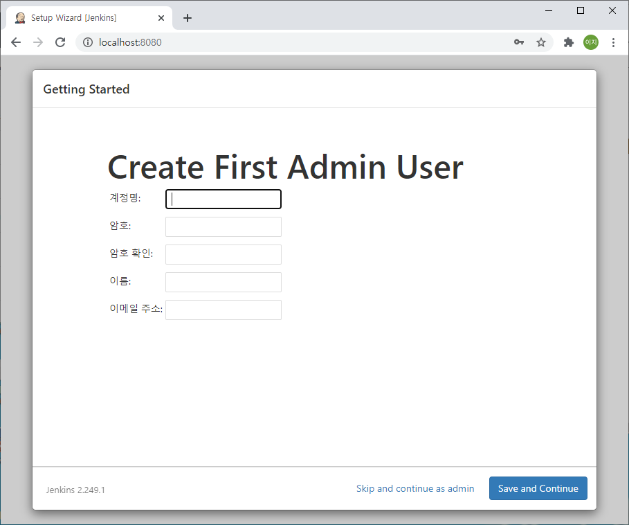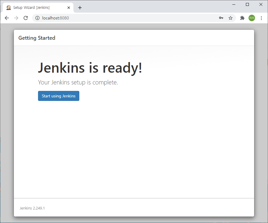 Jenkins 설치가 완료되었습니다. Start using Jenkins 실행합니다.