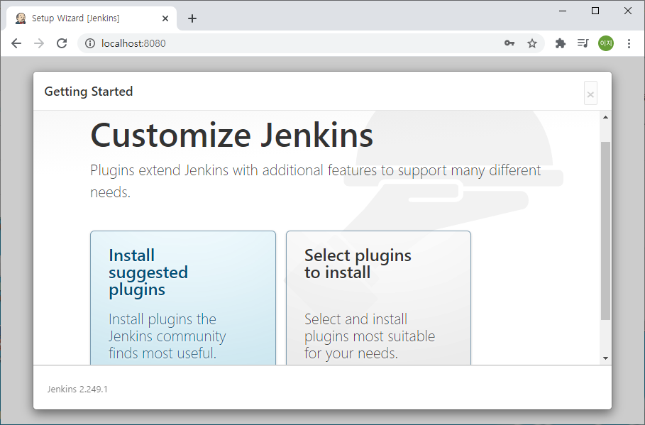 패스워드를 입력하고 나면은 Plugin 설치 페이지로 이동합니다. Install suggested plugins를 선택합니다.