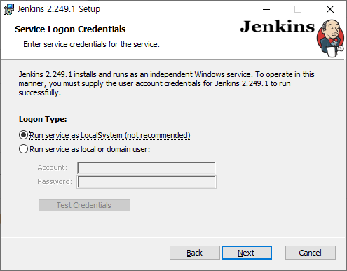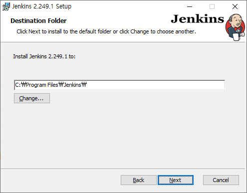 Jenkins 2.249.1 msi 파일을 실행하여 Next 버튼을 누릅니다.