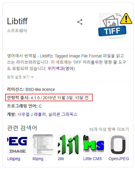 최근에 LIBTIFF의 최신 버전을 확인하기 위해서 몇 가지 웹 사이트를 확인해 보았다. 구글에서 LIBTIFF를 검색하게 되면은 아래와 같은 결과를 확인할 수 있다. 안정된 버전은 4.1.0 으로 명시되어있다 이는 위키백과에 내용을 참조하는 것으로 확인하였다.