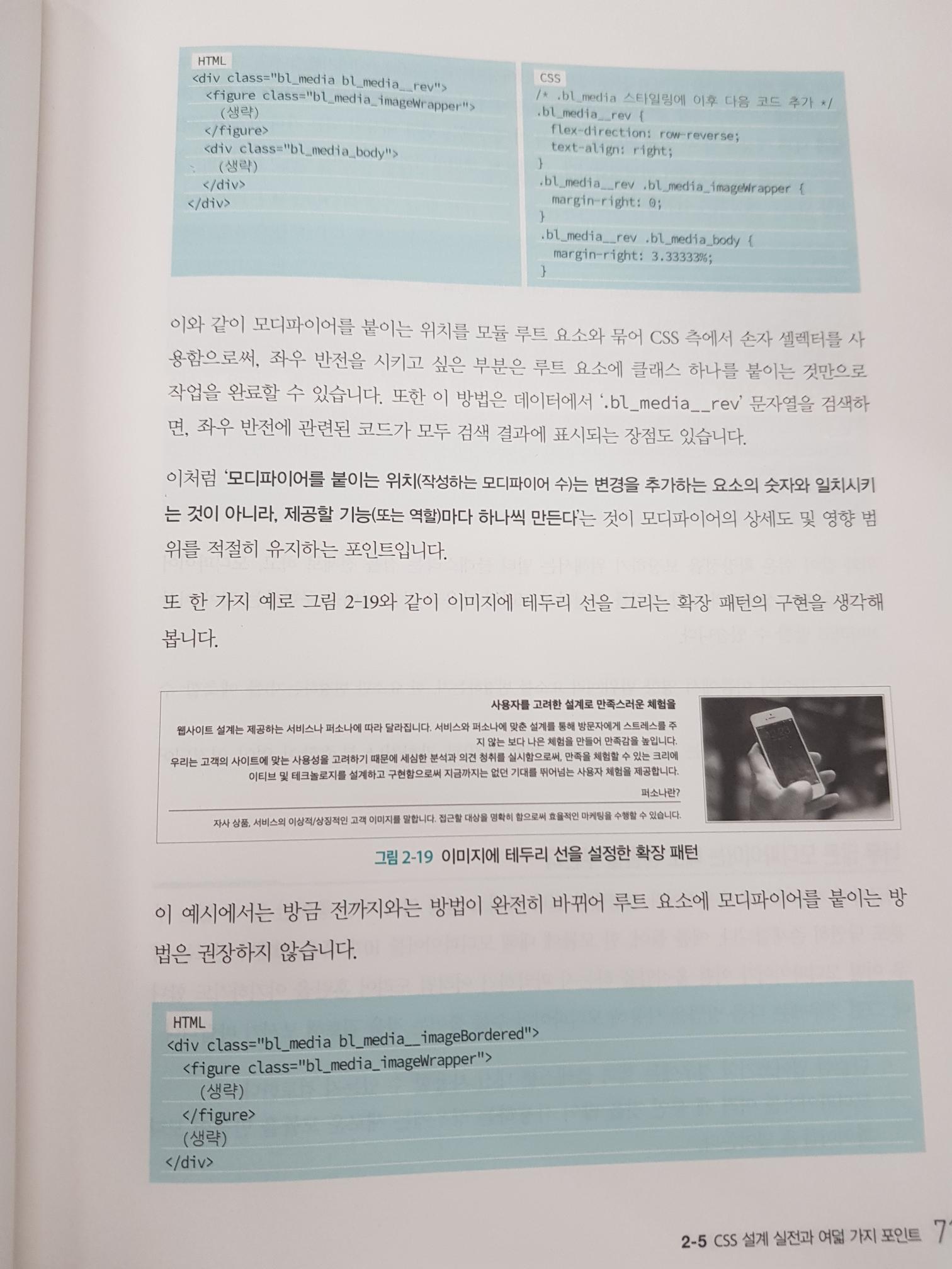 모듈의 범위를 이해 할 수 있다. 모듈이라는 의미를 '재사용을 전제로 하는 한 덩어리의 단위'라는 것으로 설명한다. 처음부터 모듈의 역할을 확실하게 정의하고 '한 모듈의 범위를 어디까지 볼 것인가?' 등 CSS 설계 시작 부터 유지보수까지 포함하여 구체적인 방법을 제시한다.