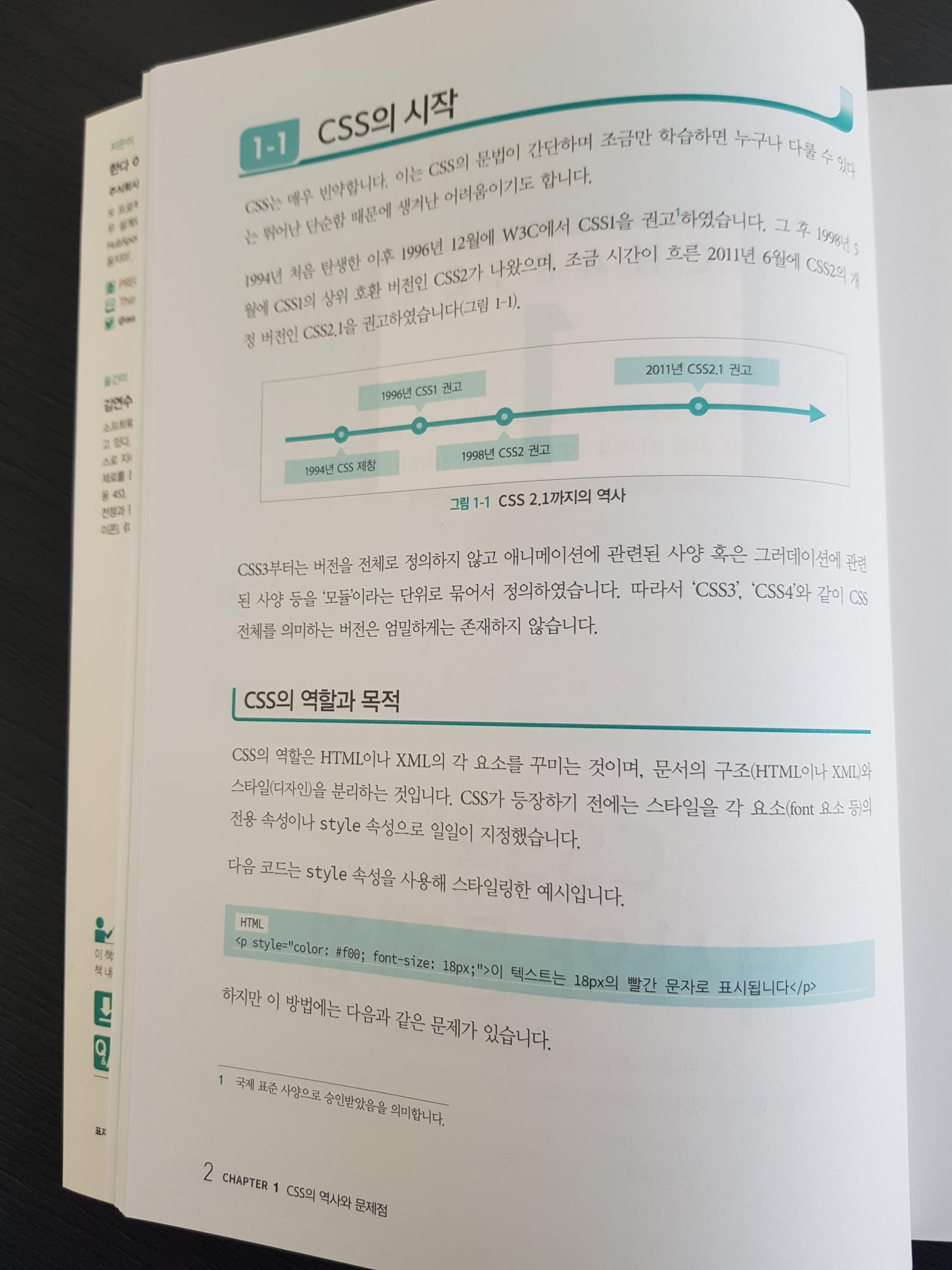 웹 페이지를 제작 할 때 CSS를 사용하다 보면 반복되는 코드로 인한 유지보수가 어려운 점에 대해서는 알고 있었지만 단순한 스크립트 언어로 생각하였다. 이 책에서는 CSS의 역사와 문제점 그리고 이를 해결하는 방법에 대해서 자세히 설명되어 있었다.