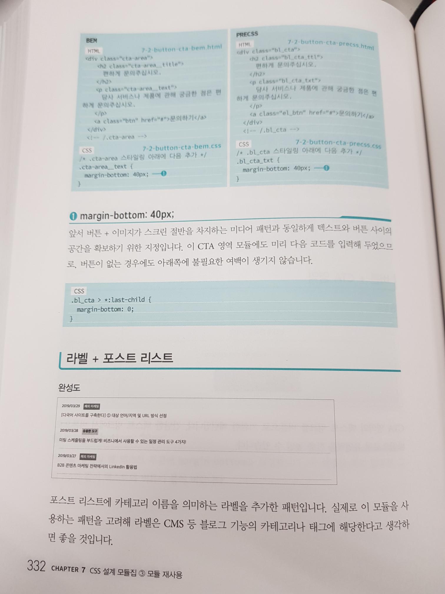 개발 방법론에 따른 BEM과 PRECSS 예제를 보며 차이를 확인 할 수 있다. 책의 전반적인 내용은 설계 단계에서의 모듈화와 코딩 컨벤션을 정의하여 HTML 요소에 CSS를 사용할 때 중복된 요소를 생기지 않도록 설계하는 방법과 CSS 모듈에 대한 방향을 제시한다. 객체지향 프로그래밍 유경험자라면 단일책임 원칙이라는 것을 많이 들어 봤을 것이다. 또, 한 CSS 모듈 설계 시 유지보수 측면에서 CSS를 하나의 모듈로 리팩토링을 하는 방법에 관해서 기술한다.