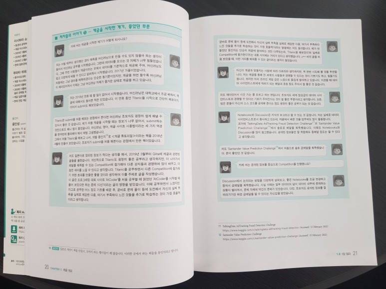 저자들이 캐슬 대회에 참여하면서 느꼈던 경험담을 위 사진처럼 대화식으로 작성되어 있어 저자와 대화를 하는 느낌을 준다. 머신러닝 알고리즘에 대한 깊은 설명은 없지만 기본적인 설명으로 캐글을 시작하는 단계에서 캐글 사용법을 쉽게 설명하여 진입 장벽을 해소할 수 있었다.