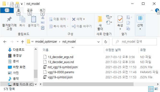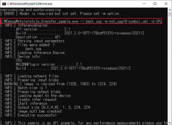 #새로운 디렉토리를 생성한다. mkdir nst_model #앞서 생성된 모델을 모두 복사한다. cp nst_vgg19-symbol.json nst_model cp vgg19-symbol.json nst_model cp ../vgg19.params nst_model/vgg19-0000.params cp models/13_decoder_args.nd nst_model cp models/13_decoder_auxs.nd nst_model #앞서 구성된 모델을 통하여 IR 을 생성한다. python3 mo.py --input_symbol <path/to/nst_model>/nst_vgg19-symbol.json --framework mxnet --output_dir <path/to/output_dir> --input_shape [1,3,224,224] --nd_prefix_name 13_decoder --pretrained_model <path/to/nst_model>/vgg19-0000.params