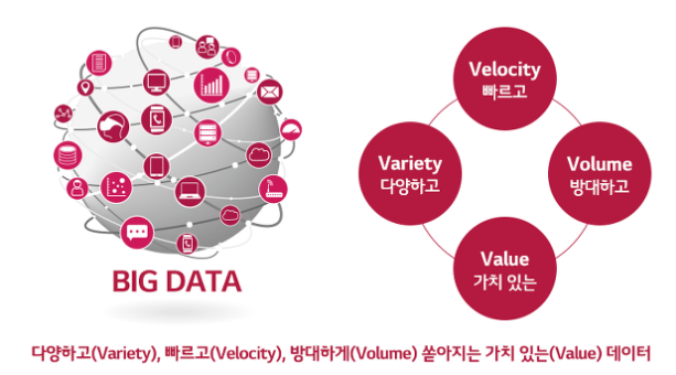 | 다양성(Variety) | 데이터베이스에 차곡차곡 쌓던 기존의 정형화된 데이터의 형태가 아니라, 사진과 이미지, 영상 등의 다양한 비정형 데이터가 전체 데이터의 90%를 차지하고 있습니다. |
