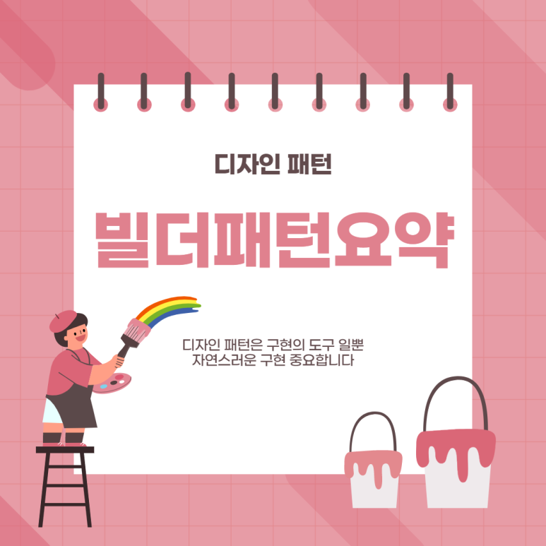 여러 복잡한 요소들의 조합이 필요한 객체를 생성해야 하거나 또는 여러 개의 다양한 객체 집합을 생성해야 할 때 객체 생성만을 전담하는 컴포넌트를 정의하여 객체 생성을 간편하게 하는 것이다. 빌더 패턴에서 빌더의 특징을 정리하면 다음과 같다.