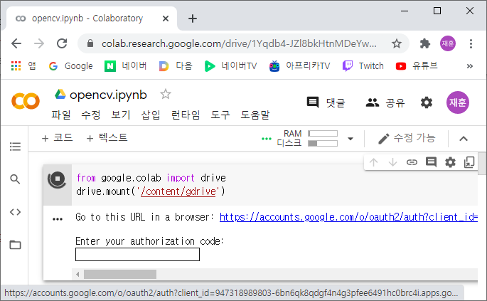 COLAB 으로 이동하여 클립보드에 복사된 인증키를 입력하고 엔터를 누른다.