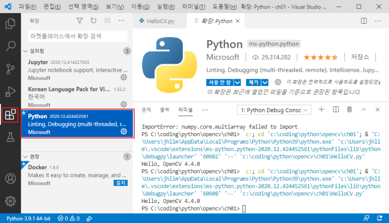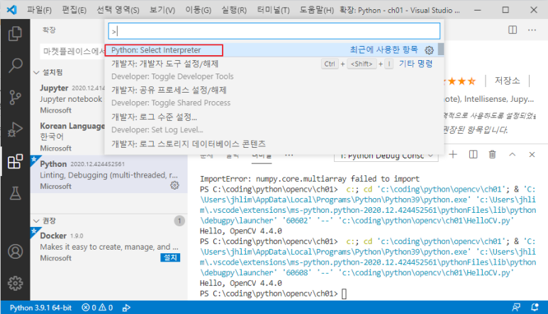 상기 설정으로 Visual Studio Code 에서 파이선과 OpenCV 를 사용하는 기본 설정 완료