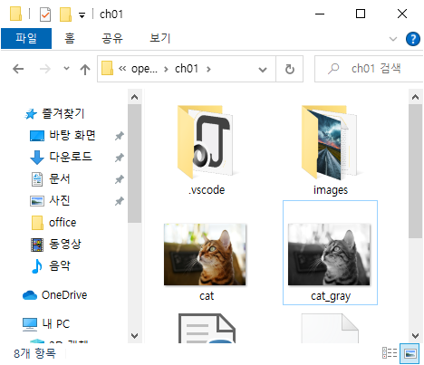 코드를 실행하고 파일탐색기로 확인해 보면 cat_gray.png 파일이 생성 된 것을 확인 할 수 있다.