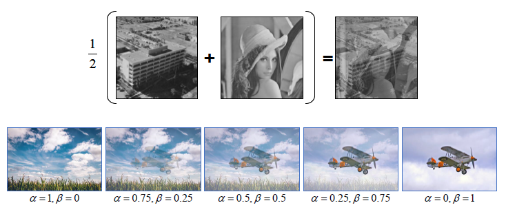보통 alpha + beta = 1 이 되도록 설정 -> 두 입력 영상의 평균 밝기를 유지