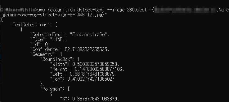 aws rekognition detect-text --image S3Object="{Bucket={BUCKET},Name=german-one-way-street-sign-3-1446112.jpg}"