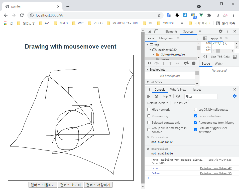 <template> <section> <h1>Drawing with mousemove event</h1> <canvas id="canvas" width="500" height="500" @mousedown="beginDrawing" @mouseup="stopDrawing" @mousemove="draw"> Canvas not supported </canvas> <br> <button id="btnPrev" class="button" @click="prev">캔버스 되돌리기</button> <button id="btnClea" class="button" @click="init">캔버스 초기화</button> <button id="btnSave" class="button" @click="upload">캔버스 저장하기</button> </section> </template> <script> export default { name: 'Painter', data () { return { isDrawing: false, x: 0, y: 0, canvas: null, }; }, methods: { draw(e) { if(this.isDrawing) { this.drawLine(this.x, this.y, e.offsetX, e.offsetY); this.x = e.offsetX; this.y = e.offsetY; } }, beginDrawing(e) { this.x = e.offsetX; this.y = e.offsetY; this.isDrawing = true; console.log(this.isDrawing); }, stopDrawing(e) { if (this.isDrawing) { this.drawLine(this.x, this.y, e.offsetX, e.offsetY); this.x = 0; this.y = 0; this.isDrawing = false; console.log(isDrawing); } }, }, mounted() { var c = document.getElementById("canvas"); this.canvas = c.getContext('2d'); }, } </script> <style scoped> #canvas { border:1px solid #000000; } </style>