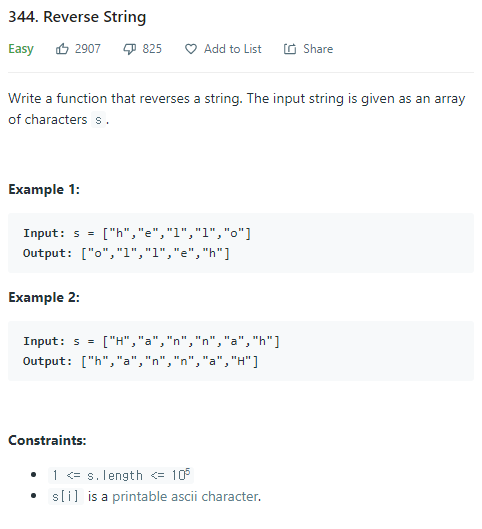 문자열을 뒤집는 함수를 작성하라. 입력값은 문자 배열이며, 리턴 없이 리스트 내부를 직접 조작하라.