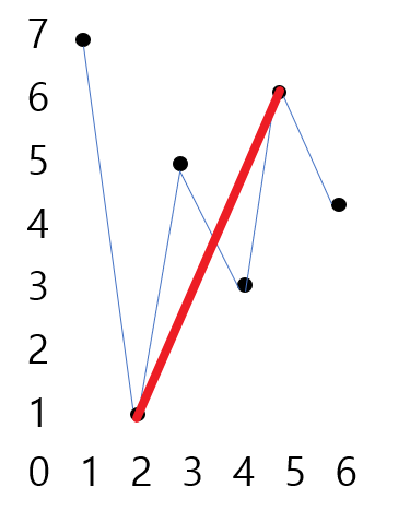 해당 문제는 아래처럼 도표를 그리면 어느 시점에 파는 것이 가장 큰 이득을 보는지 알 수 있다. 2일짜에 1원에 주식을 사고 5일짜에 6원에 팔면 가장 큰 수익을 얻게 된다.