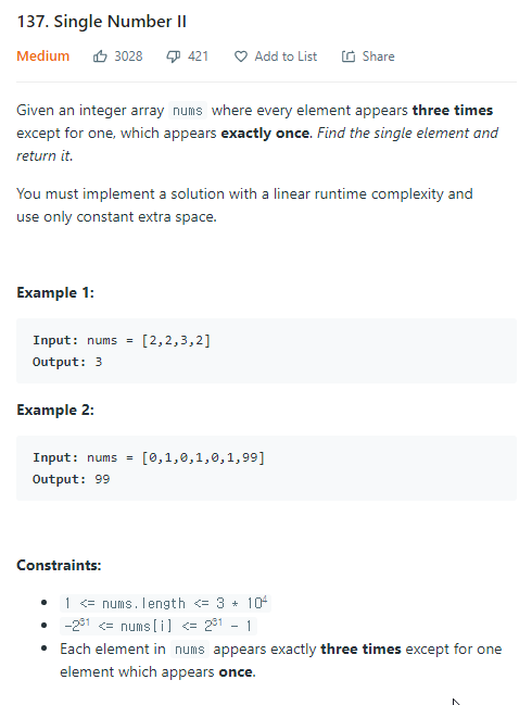 https://leetcode.com/problems/single-number-ii/