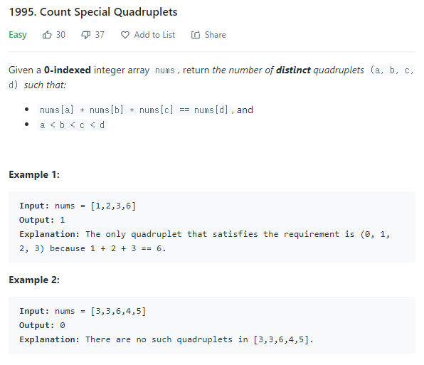 입력으로 들오는 배열에서 4개의 원소를 선택하고 선택한 원소들이 a < b < c < d 와 같고 nums[a] + nums[b] + nums[c] == nums[d] 의 조건을 맞는 조합의 갯수를 출력하라.