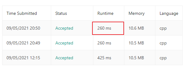 위코드처럼 반복문을 제거후 Runtime 시간을 확인 해보니 425 ms 에서 260 ms 로 시간이 단축 됬다. 사소한 수정사항이라고 생각했는데 약 162 ms 정도 속도가 개선이 된것을 보고 놀랐다. ㅎㅎ