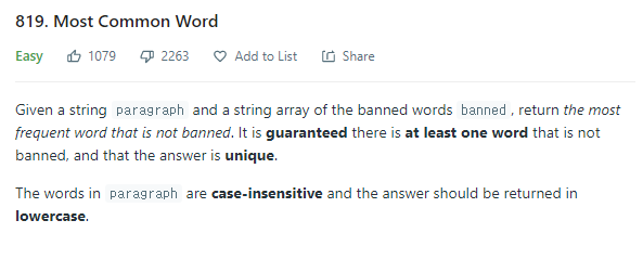 금지된 단어를 제외한 가장 흔하게 등장하는 단어를 출력하라. 대소문자 구분을 하지 않으며, 구두점(마침표, 쉼표 등) 또한 무시한다.