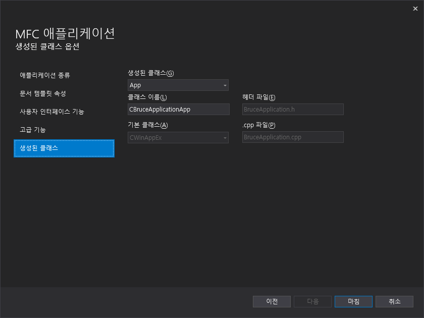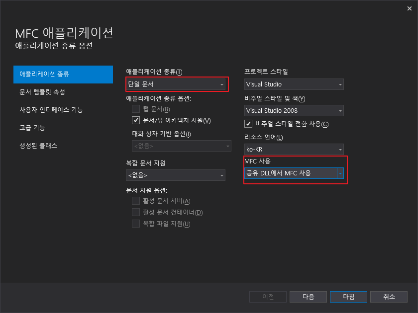 SDI(Single Document Interface) 로 설정, 공유 DLL에서 MFC 사용을 선택합니다.