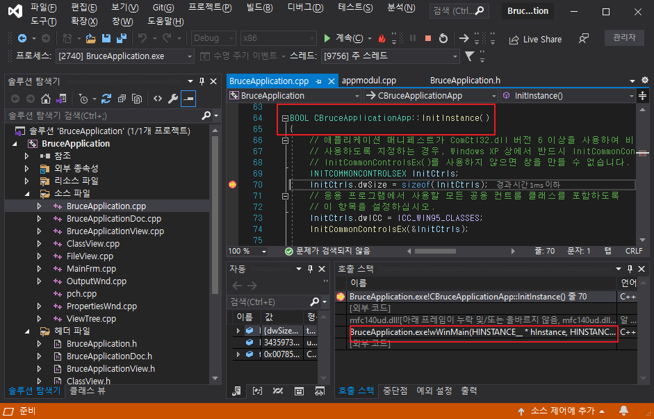 프로젝트를 실행하게 되면 SDI 경우 InitInstance() 가 호출 됩니다. 이는 App 클래스 변수가 전역변수로 선언되어 있음으로 제일 먼저 생성자가 호출되고 MFC 코드에 숨겨진 AfxWinMain 함수에서 호출 됩니다.