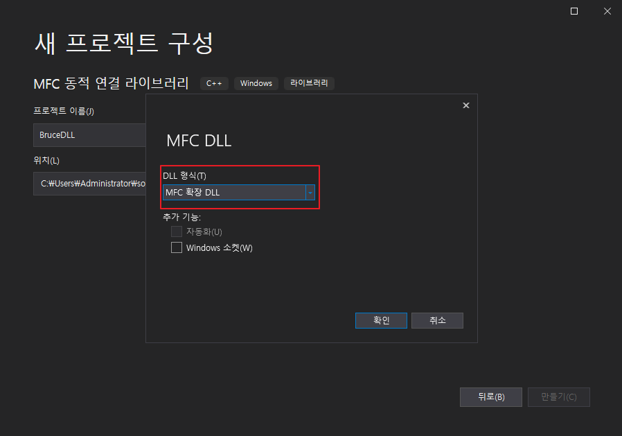 DLL 형식을 MFC 확장 DLL로 선택합니다.