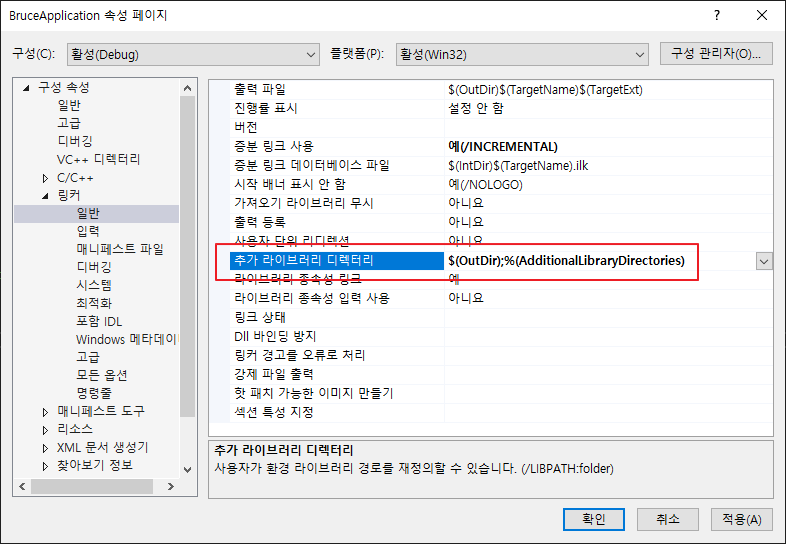 이 상태로 빌드(F7) 해도 빌드가 되지 않습니다. 프로젝트 우클릭 -> 속성에서 구성 속성 -> 링커 -> 일반에 있는 추가 라이브러리 디렉터리에다가 아래와 같이 입력합니다.