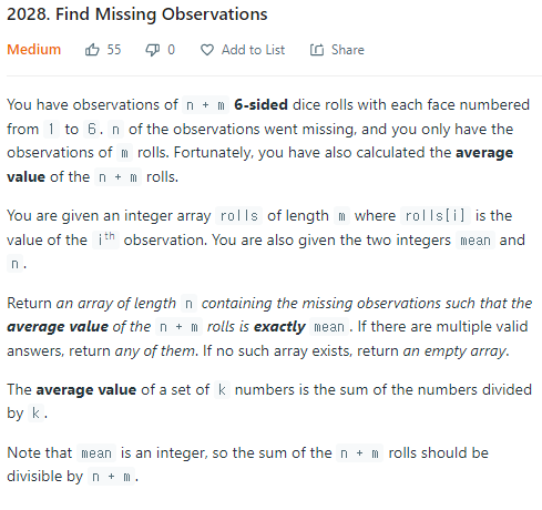missingSum을 계산하기 위해 약간의 수학이 필요합니다 n + m 롤의 평균값 은 정확히 mean 값입니다.